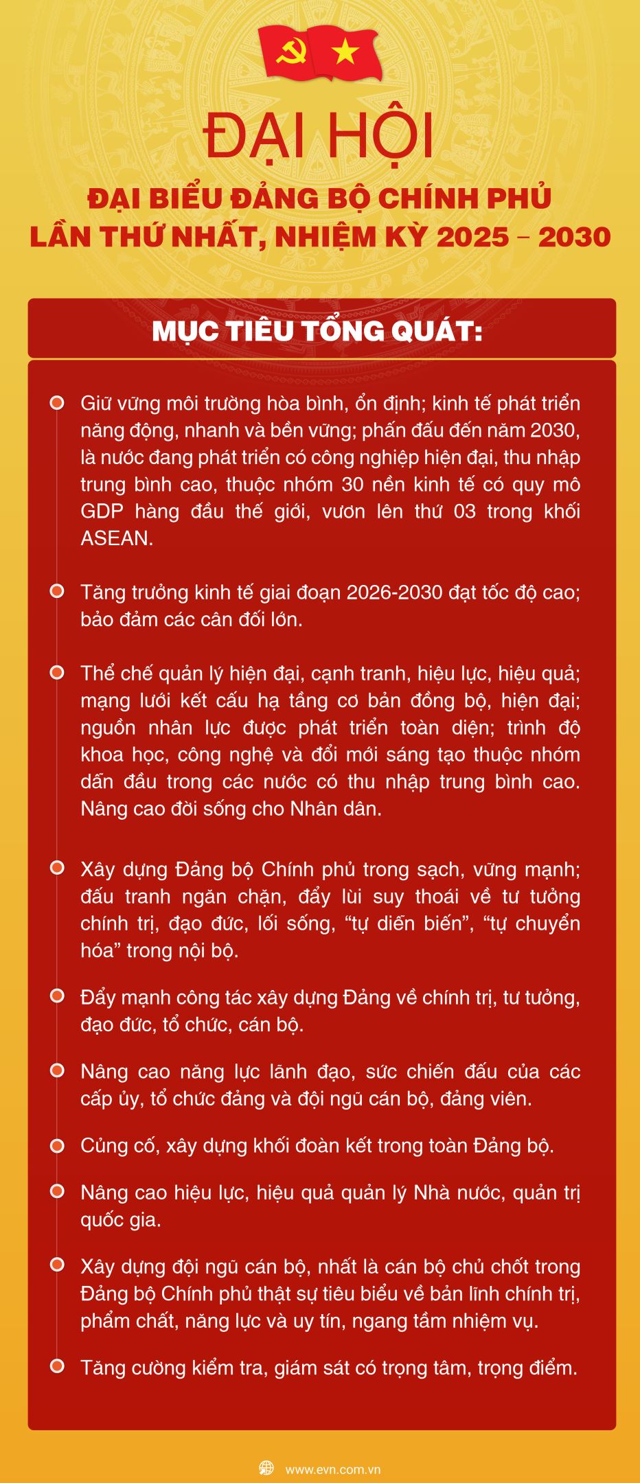 Đại hội đại biểu Đảng bộ Chính phủ lần thứ nhất, nhiệm kỳ 2025 - 2030 khẳng định quyết tâm tổ chức thực hiện có hiệu quả nhiệm vụ phát triển kinh tế - xã hội, quốc phòng, an ninh, đối ngoại; xây dựng Đảng bộ trong sạch, vững mạnh, thực hiện thắng lợi các mục tiêu phát triển đất nước đến năm 2030 khi Đảng ta tròn 100 năm thành lập (1930 - 2030); hướng tới hiện thực hóa tầm nhìn đến năm 2045, kỷ niệm 100 năm thành lập nước (1945 - 2045) mà Đại hội XIV của Đảng xác định.
